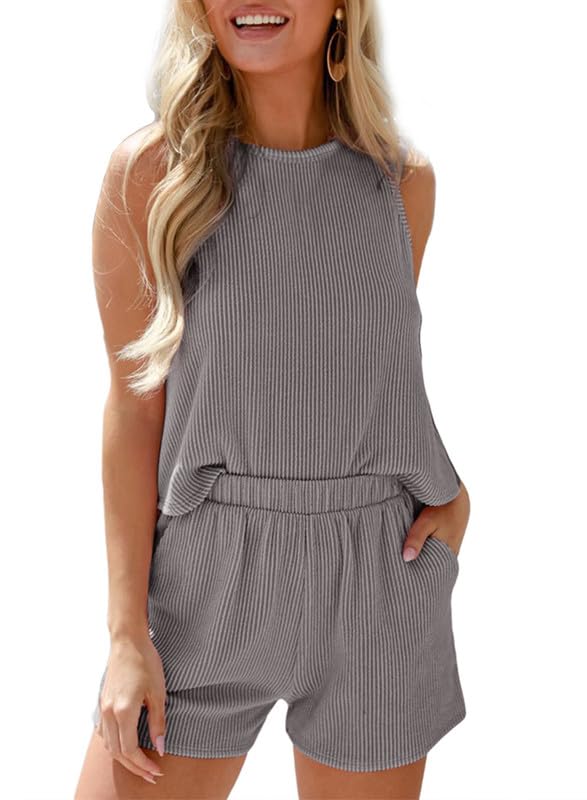 SHEWIN Women’s Summer 2 Piece Outfits Shorts Sets Matching Set Striped Loungewear 2024 Medium Medium Grey