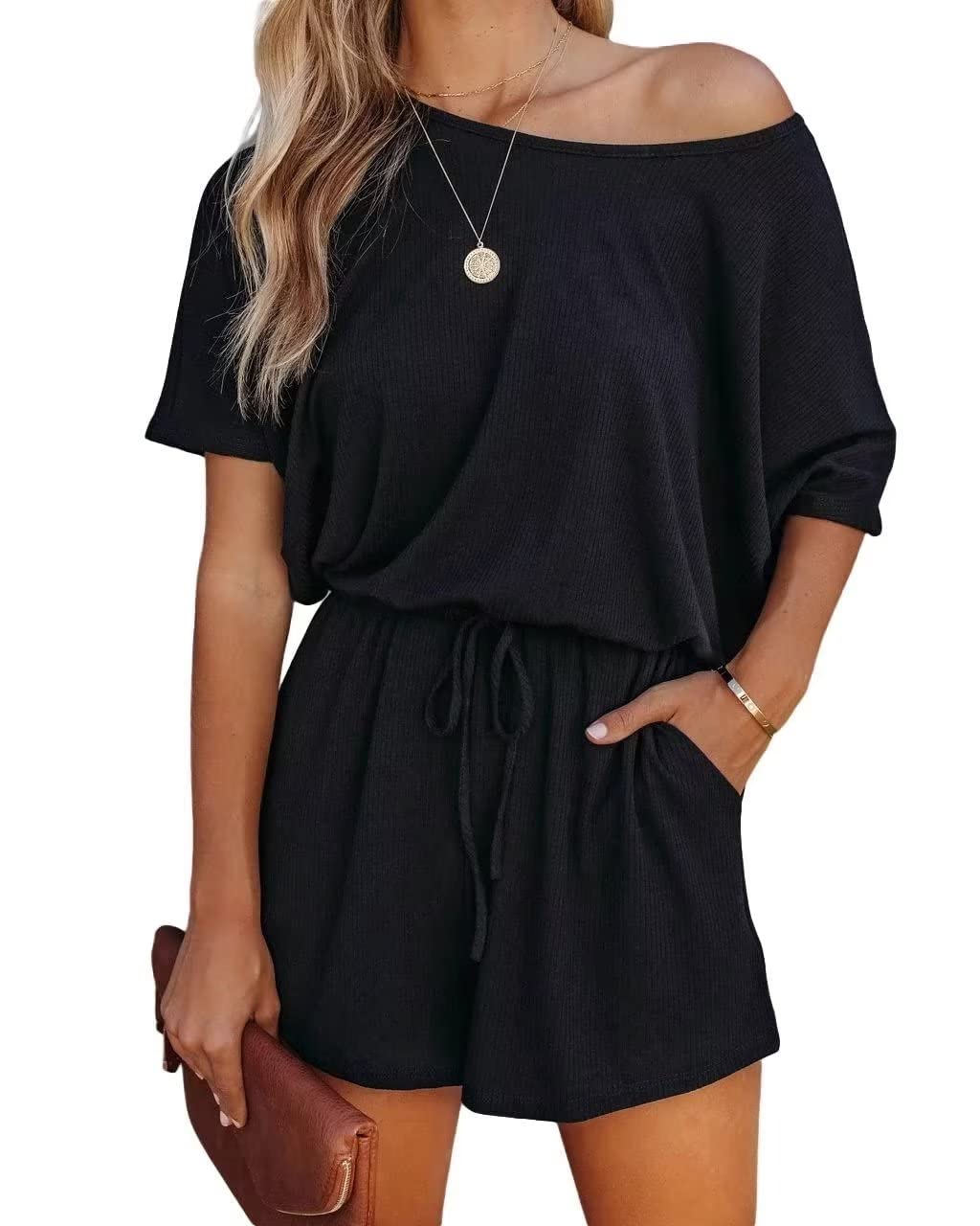 Lacozy Women’s 2024 Summer Short Sleeve Off The Shoulder Rompers Casual Shorts One Piece Overall Jumpsuits Dressy Large One Piece Black Jumpsuit